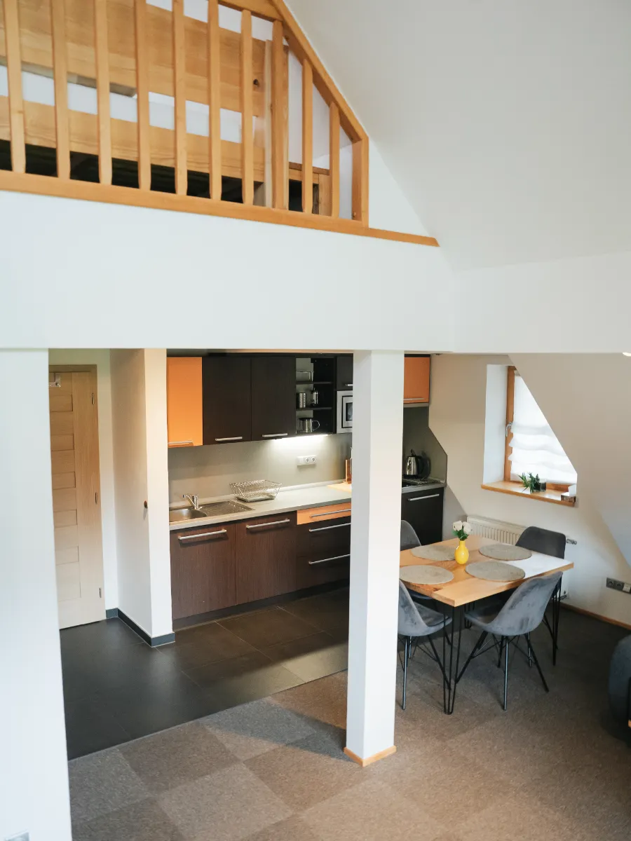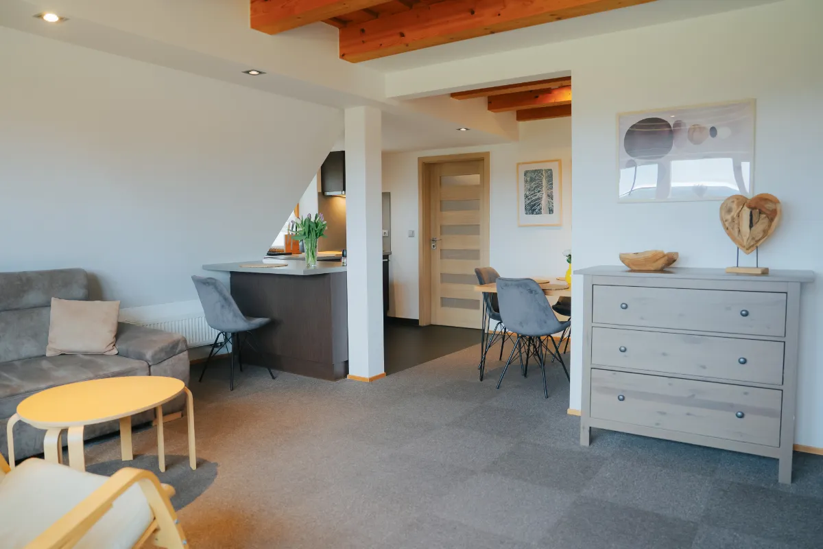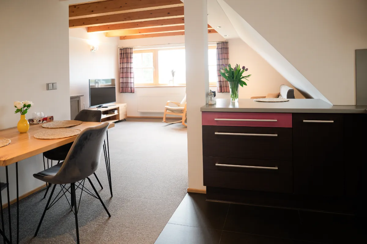 Náš největší apartmán o dispozici 2+kk nabízí příjemné ubytování s dostatečným soukromím až pro 4 osoby a jedinečný výhled na Roklany. Disponuje také oddělenou předsíní a plně vybaveným kuchyňským koutem, ve kterém nechybí ani myčka nádobí nebo kávovar.